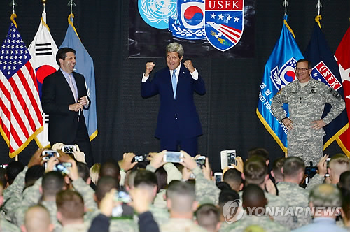 △ 인사하는 존 케리 미 국무장관 (서울 사진공동취재단=연합뉴스) 존 케리 미국 국무장관이 18일 오후 서울 용산구 주한미군기지를 방문해 주한미군들에게 인사를 하고 있다.