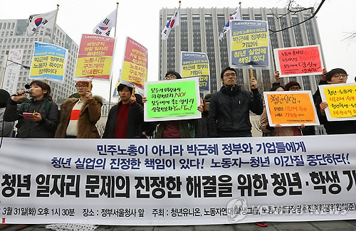 | △ 청년실업 해소 촉구 청년·학생 기자회견 (서울=연합뉴스) 황광모 기자 = 31일 오후 서울 세종로 정부서울청사 앞에서 열린 청년 일자리 문제의 진정한 해결을 위한 청년·학생 기자회견에서 참가자들이 청년실업의 책임이 "정부와 기업들에 있다"며 일자리 만들기와 비정규직 폐지를 요구하고 있다. 2015.3.31 hkmpooh@yna.co.kr |