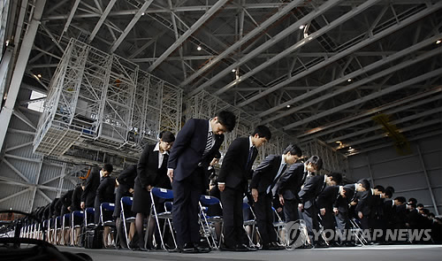 | △ 올봄 일본 대졸자의 취업률이 96.7%를 기록했다. 사진은 전일본공수(ANA) 입사식. (AP=연합뉴스 자료사진) |