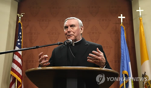 △ 미국 가톨릭 시카고 대교구 소속 프랜시스 케인 주교가 2014년 1월 성폭행 혐의 사제 신원과 혐의 내용을 공개한 뒤 기자회견을 하고 있다.(AP=연합뉴스 자료사진)