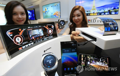 | △ LG디스플레이 OLED 미디어 데이 (서울=연합뉴스) 홍해인 기자 = 19일 오전 서울 종로구 그랑 서울 나인 트리 컨벤션에서 열린 LG디스플레이 OLED(유기발광다이오드) 미디어 데이 행사에서 홍보 도우미들이 휘어지는 플렉시블 OLED를 비롯해 OLED TV, 스마트 폰, 스마트 워치 등 다양한 OLED 제품들을 소개하고 있다. 2015.5.19 hihong@yna.co.kr |