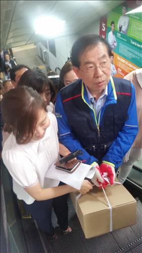 박원순 서울시장이 19일 65세 이상 무임승차제도를 활용해 지하철로 택배 배달을 하는 어르신을 따라 택배 배달에 나섰다. 어르신들의 일자리를 직접 체험해보기 위해서다.