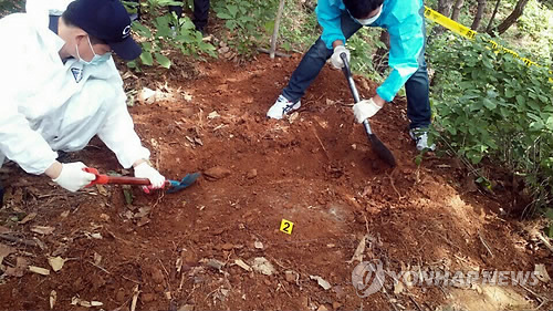 | △ 야산에 암매장 시신 발굴 (부산=연합뉴스) 20대 남성이 결별을 통보한 동거녀를 살해한 뒤 야산에 암매장한 사건과 관련, 충북 제천시에 있는 한 야산에서 18일 경찰이 시신 발굴작업을 벌이고 있다. 2015.5.18 << 제천경찰서 제공 >> ccho@yna.co.kr |