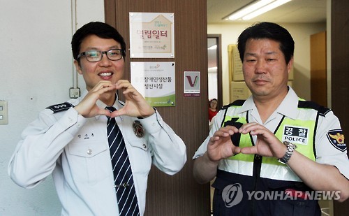 | △ 서울 강서경찰서, 공무집행방해 배상금 불우이웃에 기부 (서울=연합뉴스) 서울 강서경찰서는 공무집행방해 등 공권력 침해 사건으로 지급명령을 신청해 확보한 200여만원을 관내 어려운 이웃에게 전달했다고 20일 밝혔다. 이날 서울 강서구에서 열린 열림일터 기부식에 참석한 전수훈 경장(왼쪽)과 위성익 경위가 포즈를 취하고 있다. 2015.5.20 << 서울 강서경찰서 제공 >>2vs2@yna.co.kr |