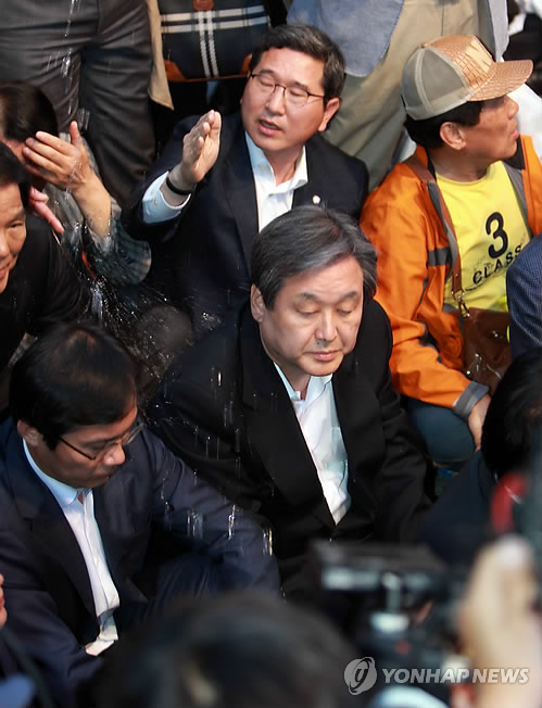 | △ 물세례 맞는 김무성 대표 (광주=연합뉴스) 형민우 기자 = 새누리당 김무성 대표가 17일 오후 광주 동구 금남로에서 열린 5·18광주민주화운동 전야제에 참석했다가 광주 방문을 반대하는 시민의 물세례를 맞고 있다. 김 대표는 결국 전야제 행사에 참석하지 못하고 자리를 떴으며 이 과정에서 취재진과 시민, 경찰 사이에서 몸싸움이 벌어지기도 했다. 2015.5.17 minu21@yna.co.kr |
