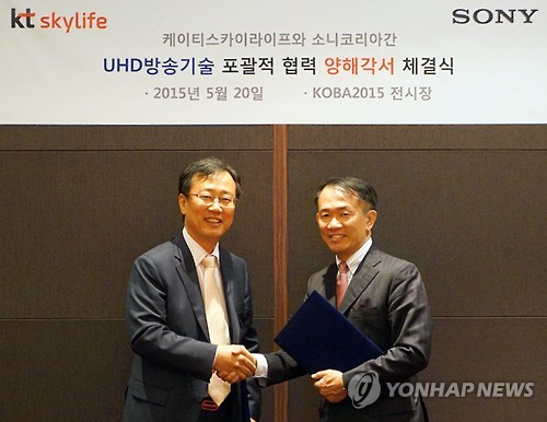 (서울=연합뉴스) 정성호 기자 = KT스카이라이프는 20일 서울 삼성동 인터컨티넨탈호텔에서 소니코리아와 4K UHD(초고해상도) 장비 제공 및 기술 협력을 주 내용으로 하는 업무협약(MOU)을 체결했다고 21일 밝혔다.
