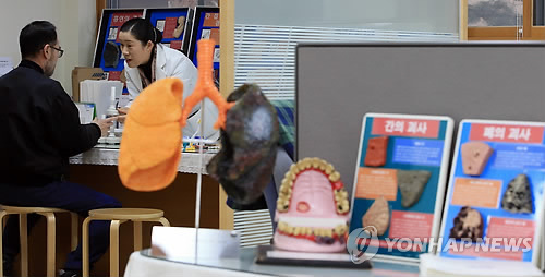 | △ 10만명 넘어선 금연클리닉 등록자 (서울=연합뉴스) 홍해인 기자 = 금연 열풍으로 금연클리닉 등록자가 새해 들어 보름만에 10만명을 돌파했다. 20일 보건복지부에 따르면 지난 2~16일 전국 보건소의 금연클리닉 등록자는 10만5천332명으로 지난해 같은 기간의 2만7천209명보다 3.9배 많은 것으로 나타났다. 이는 하루 평균 6천583명이 등록하는 셈이다. 사진은 이날 오후 서울 강남구 보건소 금연 클리닉 상담 모습과 폐 비교 모형. 2015.1.20 hihong@yna.co.kr |
