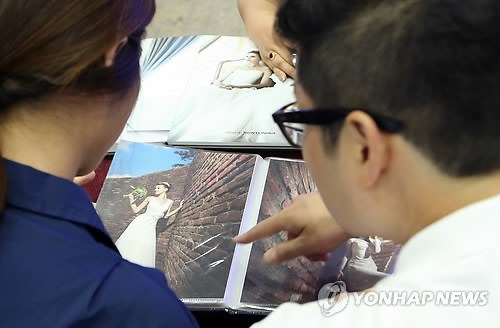 | △ 예비부부들이 웨딩앨범을 살펴보고 있다. (연합뉴스 자료사진) |
