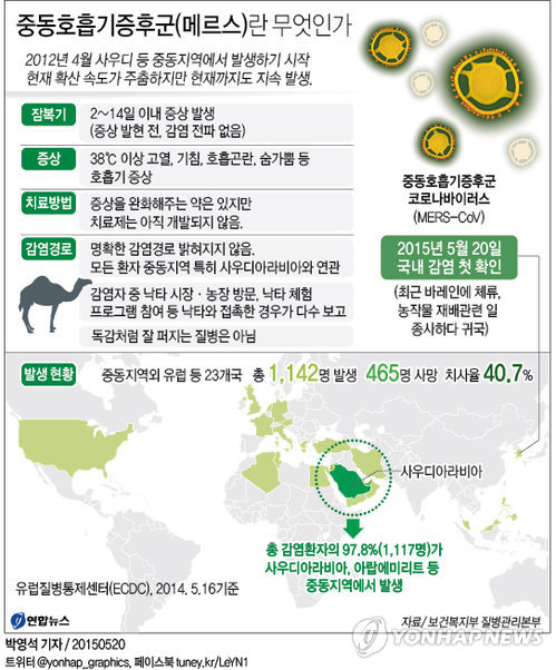 | △ <그래픽> 중동호흡기증후군(메르스)란 무엇인가 (서울=연합뉴스) 박영석 기자 = 신종 바이러스인 중동호흡기증후군(메르스)에 감염된 국내 환자가 처음으로 확인됐다. 보건복지부 질병관리본부는 중동지역에 다녀온 68세 남성이 중동호흡기질환에 감염된 것으로 확인됐다고 20일 밝혔다. zeroground@yna.co.kr |