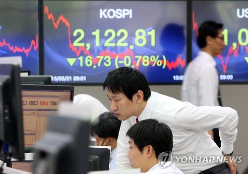 △ 코스피 2,122.81에 장마감 (서울=연합뉴스) 서명곤 기자 = 코스피가 전 거래일보다 16.73p(0.78%) 내린 2,122.81에 거래를 마감한 21일 오후 서울 중구 명동 외환은행 본점 딜링룸에서 딜러들이 대화를 나누고 있다.