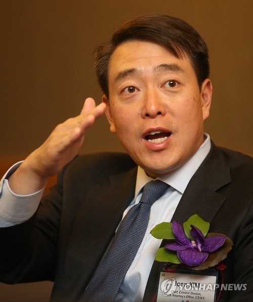 | △ 김 준 뉴욕남부연방검찰청 차장검사 (서울=연합뉴스) 서명곤 기자 = 21일 오전 한인검사협회 총회와 2015 서울 국제 형사법 콘퍼런스가 열리고 있는 서울 서초구 반포동 JW메리어트호텔에서 김 준 미국 뉴욕남부연방검찰청 차장검사가 취재진의 질문에 답하고 있다. 2015.5.21 seephoto@yna.co.kr |