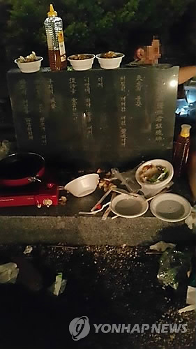 △ (서울=연합뉴스) 설승은 기자 고려대에서 5.18민주화운동 기념일에 일부 학과 학생들이 교내 민주광장 민주열사추모비 근처에서 주점을 운영하면서 추모비를 술안주와 쓰레기 등으로 어지럽혀 교내외에서 비판을 받았다. 2015. 5. 21 <<고려대 경제학과 학생회 페이스북>> ses@yna.co.kr