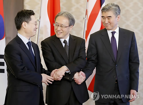 | △ 황준국(왼쪽) 한국 외교부 한반도평화교섭본부장, 성 김(오른쪽) 미국 국무부 대북정책 특별대표, 이하라 준이치(伊原純一·가운데) 일본 외무성 아시아대양주국장이 한국·미국·일본 6자회담 수석대표 회의를 시작하기에 앞서 악수를 하고 있다. (교도=연합뉴스) |