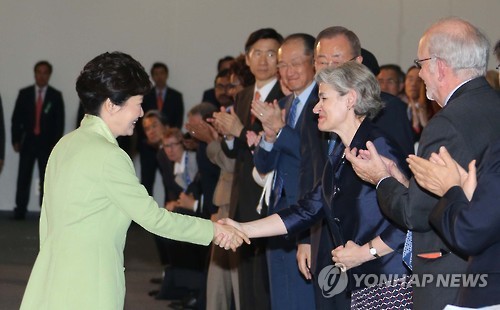 △ 박근혜 대통령과 유네스코 사무총장 (인천=연합뉴스) 백승렬 기자 = 박근혜 대통령과 이리나 보코바 유네스코 사무총장 등 참석자들이 19일 인천시 송도 컨벤시아에서에서 열린 세계교육포럼 개회식에서 악수하고 있다. 2015.5.19 srbaek@yna.co.kr