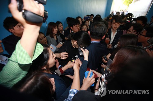 그러나 그는 회사 관계자들로 보이는 이들의 보호를 받으며 주차장에 대기하고 있던 차에 올라탔다.