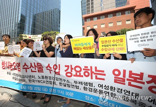 | △ 방사능오염 수산물 수입 강요 일본정부 규탄 (서울=연합뉴스) 한종찬 기자 = 환경운동연합, 시민방사능감시센터 등 환경단체 회원들이 22일 오전 서울 종로구 일본대사관 앞에서 방사능오염 수산물 수입 강요하는 일본 정부를 규탄하며 기자회견을 하고 있다. 이들은 이날 기자회견에서 "일본 정부는 WTO 제소 추진을 중단하고, 후쿠시마 방사능 오염 문제부터 제대로 해결하라"고 주장했다. |