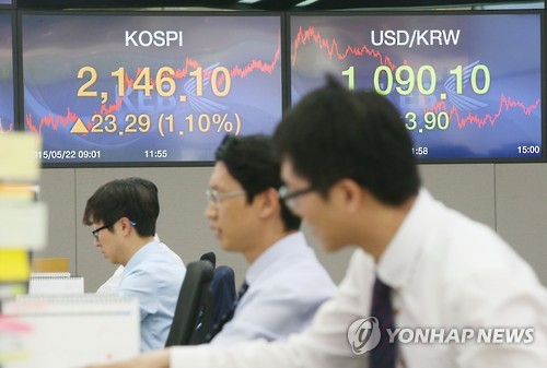 △ 코스피 큰 폭으로 올라 (서울=연합뉴스) 박동주 기자 = 코스피가 22일 외국인과 기관의 쌍끌이 매수에 큰 폭으로 올랐다. 코스피 지수는 전날보다 23.29포인트(1.10%) 오른 2,146.10으로 장을 마쳤다. 이날 오후 서울 중구 외환은행 본점 딜링룸에서 직원들이 업무를 보고 있다.