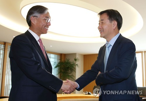 △ 추궈홍 주한중국대사 연합뉴스 방문 (서울=연합뉴스) 추궈홍(邱國洪) 주한 중국대사(왼쪽)가 22일 서울 종로구 수송동 연합뉴스·연합뉴스TV 본사를 방문, 박노황 연합뉴스 사장과 인사하고 있다.