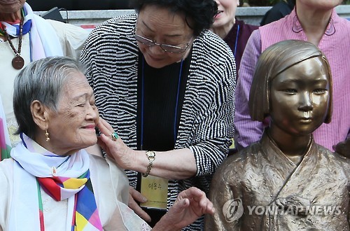 | △ 슬픔 위로하는 위안부 할머니들 (서울=연합뉴스) 진성철 기자 = 일본군 위안부 피해자인 이용수 할머니(가운데)가 23일 서울 종로구 주한 일본대사관 앞의 '평화의 소녀상' 에서 필리핀 위안부 피해자인 에스테리타 바스바뇨 디를 위로하고 있다. 에스테리타 씨는 22일부터 한국정신대문제대책협의회 주최로 열린 '제13차 일본군 위안부 문제해결을 위한 아시아연대회의'에 참석했다. 2015.5.23 zjin@yna.co.kr |