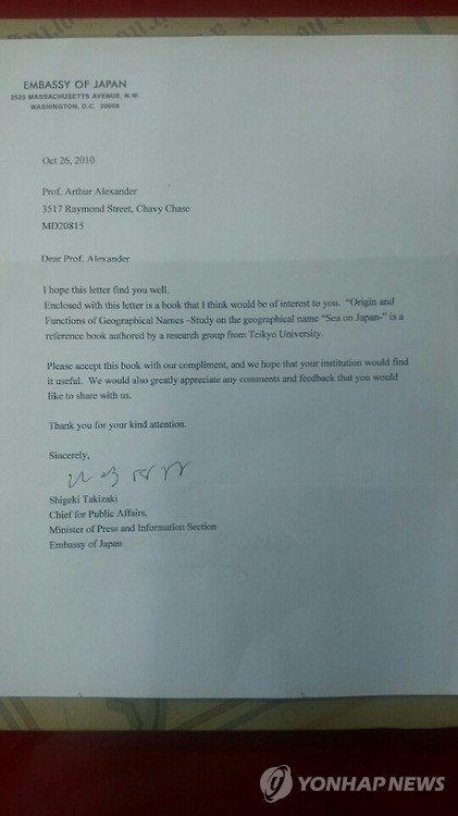 △ 주미일본대사관 배포 추정 '일본해 합리화' 편지 발견 (서울=연합뉴스) 고은지 기자 = 주미일본대사관이 동해의 일본해 표기를 합리화하고자 미국 대학이나 기관을 상대로 '학술 외교'를 벌인 것으로 추정되는 편지. 2010년 10월 26일 보낸 편지에서 주미일본대사관은 조지타운대 아서 알렉산더 일본경제연구소장에게 동해의 일본해 표기를 합리화하기 위한 연구가 담긴 서적을 함께 보내며 연구에 써달라고 요청했다.(김태진 대표 제공)