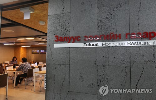 △ 몽골 식당 '잘루스' (서울=연합뉴스) 신재우 기자 = 서울 동대문 쇼핑타운 부근에 위치한 몽골 식당 '잘루스'. 지난 2006년 문을 연 이곳은 몽골 이주민이 운영하고 있다. 2015.5.22 withwit@yna.co.kr