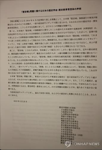 (도쿄=연합뉴스) 이세원 특파원 = 역사학연구회 등 일본의 16개 역사 연구·교육 관련 단체는 25일 일본군 위안부 문제에 대한 왜곡 중단을 촉구하는 성명을 일본어와 영어로 발표했다.