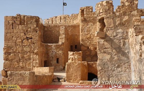 △ IS, 시리아 팔미라 유적에 깃발 게양 (두바이=연합뉴스) 강훈상 특파원 = 수니파 무장조직 '이슬람국가'(IS)가 시리아 홈스 주(州)의 고대 유적도시 팔미라 점령을 과시하기 위해 유적에 깃발을 게양한 사진을 22일(현지시간) 인터넷을 통해 유포했다.2015.5.23 (출처 : 트위터) hskang@yna.co.kr