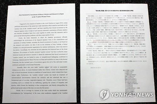 이들 단체는 이날 중의원 제2의원회관에서 발표한 '위안부 문제에 관한 일본의 역사학회·역사교육자단체의 성명'에서 일본군 위안부 문제에 관해 "강제연행된 위안부의 존재는 그간의 많은 사료와 연구에 의해서 실증돼 왔다"고 밝혔다.