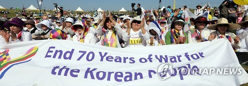 | △ 위민크로스디엠지 (파주=연합뉴스) 임병식 기자 = 24일 오후 경기도 파주시 임진각 평화누리 공원에서 열린 '위민크로스디엠지'(WCD) 행사에서 여성운동가들이 박수를 치고 있다. 미국의 여성운동가 글로리아 스타이넘이 주도하는 '한반도 여성 평화걷기'행사는 분단 70주년을 맞아 한반도 평화와 남북통일을 염원하며 비무장지대(DMZ)를 걸어서 넘고 싶다는 의미로 기획됐다. andphotodo@yna.co.kr |