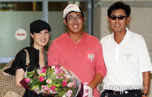 △ 안재형-자오즈민-안병훈 가족 (서울=연합뉴스) 영국 잉글랜드 서리주 버지니아 워터에서 끝난 유럽프로골프투어 BMW PGA챔피언십 우승자 안병훈(가운데)은 탁구 선수 출신 안재형(오른쪽)-자오즈민을 부모로 둔 '스포츠인 2세'다. 사진은 지난 2009년 9월 한국오픈에 출전하기 위해 인천공항을 통해 귀국하는 안병훈 가족. 2015.5.25 << 연합뉴스DB >> photo@yna.co.kr