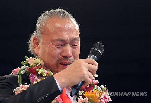 △ 눈물의 은퇴식 (서울=연합뉴스) 이정훈 기자 = 노장 프로레슬러 이왕표가 25일 서울 중구 동호로 장충체육관에서 열린 WWA '이왕표 은퇴기념 포에버 챔피언'에서 은퇴사를 하며 눈물을 흘리고 있다.