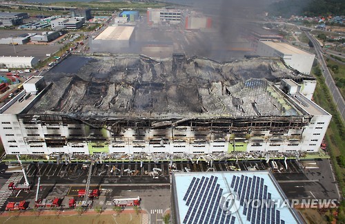 | △ 불타버린 물류창고 (김포=연합뉴스) 항공촬영팀 = 25일 오후 화재가 발생한 경기도 김포시 고촌읍 제일모직 물류창고가 불에 타 뼈대가 앙상하게 드러나 있다. superdoo82@yna.co.kr |