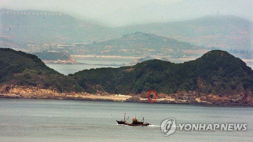 | △ 북한이 연평도 바로 앞 무인도인 '갈도'에 122㎜ 방사포 진지를 구축하는 것으로 분석됐다. 26일 군 당국에 따르면 북한은 지난 3월부터 병력과 장비를 동원해 갈도에서 터파기 공사를 진행해오다가 최근 벙커 형태의 5개의 유개화(덮개가 있는) 진지를 완공했다. 사진은 2009년 5월 28일 연평도에서 바라본 갈도. 붉은 원안은 당시 군당국이 북한이 해안포를 배치한 것으로 추정한 동굴진지. (연합뉴스 자료사진) |