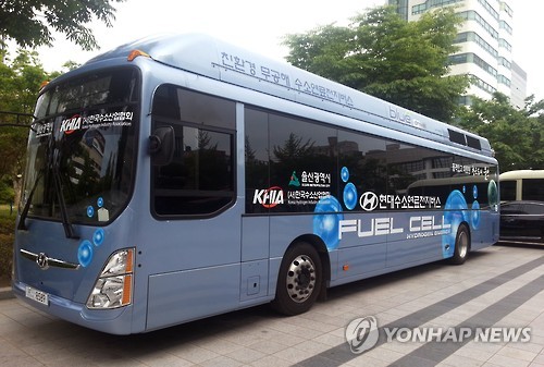 | △ 울산서 운행될 수소연료전지버스 (울산=연합뉴스) 이상현 기자 = 6월부터 울산에서 처음 운행될 수소연료전지버스가 공개되고 있다. 2015.5.27 leeyoo@yna.co.kr |