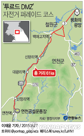 | △ <그래픽> '투르드 DMZ' 자전거 퍼레이드 코스 (서울=연합뉴스) 이재윤 기자 = 행정자치부는 경기도·강원도와 더불어 광복 70주년을 기념하는 '2015 투르드 DMZ 평화누리길 자전거 퍼레이드'를 30일 경기도 연천에서 개최한다고 27일 밝혔다. 자전거 행진은 연천공설운동장에서 출발해 신탄리역, 강원도 철원군 백마고지역, 월정리역을 지나 노동당사를 돌아오는 총 61㎞ 구간에서 진행된다. yoon2@yna.co.kr 페이스북 tuney.kr/LeYN1 트위터 @yonhap_graphics |