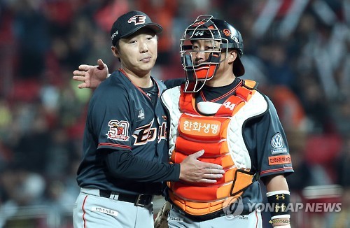 | △ 프로 야구 한화 이글스 투수 배영수(왼쪽)와 포수 조인성(연합뉴스 자료사진) |