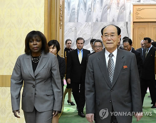 △ 유엔 세계식량계획 사무총장 일행 접견한 김영남 위원장 (평양 조선중앙통신=연합뉴스) 김영남 북한 최고인민회의 상임위원장이 20일 평양 만수대의사당에서 어써린 커즌 유엔 세계식량계획(WFP) 사무총장 일행을 접견했다고 조선중앙통신이 이날 보도했다. 2014.5.20 photo@yna.co.kr
