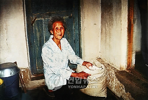 | △ 북한의 한 주민이 국제적십자사연맹(IFRC)에서 제공한 밀가루를 받고 흡족해하는 모습으로 지난 1997년 4월에 촬영된 것이다. 2015.5.28.<<연합뉴스DB>> |