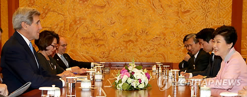 | △ 박근혜 대통령이 지난 18일 오전 청와대에서 한미 외교장관 회담 등의 일정으로 방한한 존 케리 미국 국무장관을 접견하고 있다. 2015.5.18 |