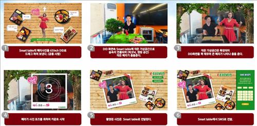 예를 들어 고객이 세븐일레븐의 도시락 모델과 함께 식사를 하는 장면을 원하면 스마트 테이블의 해당 기능을 터치해 벽면 등에 본인의 현재 모습과 함께 가상현실이 조합돼 나타나도록 할 수 있다.