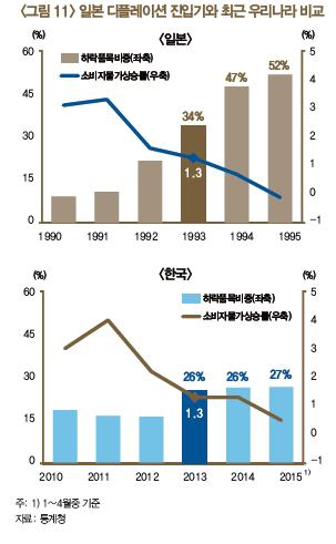 연구진은 이런 국내 물가 상황에 대해 일본이 디플레에 본격 진입한 1995년 전후와는 상당히 다르다고 분석했다.