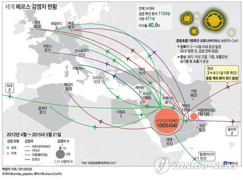 지난 16일 기준 유럽질병예방통제청(ECDC)이 발표한 자료를 보면 2012년 2월부터 현재까지 전 세계적으로 메르스 환자는 우리나라를 포함해 총 24개 국가에서 1천154명이 발생했다. 이 가운데 471명이 사망했다.