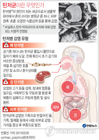 | △ <그래픽> 탄저균이란 무엇인가 (서울=연합뉴스) 반종빈 기자 = 미군이 살아있는 탄저균을 다른 연구기관으로 보내는 사고가 발생했다. 미국의 9개 주는 물론, 주한미군 기지로도 탄저균 표본이 보내졌다. bjbin@yna.co.kr 페이스북 tuney.kr/LeYN1 트위터 @yonhap_graphics |
