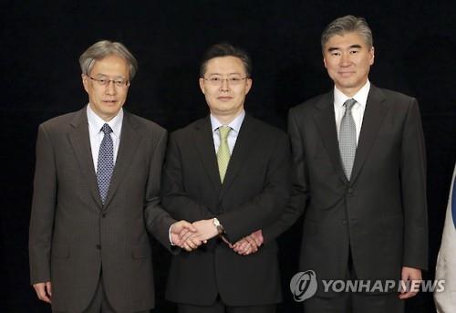 | △ 27일 서울에서 만난 한미일 6자회담 수석대표들(AP.연합뉴스.자료사진) |