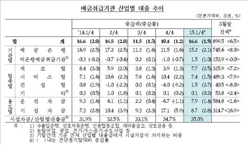 한국은행이 29일 발표한 '1분기 중 예금취급기관 산업별 대출금' 자료를 보면 1분기 말(3월 말) 기준 예금취급기관의 산업대출 잔액은 899조5천억원으로 작년 말보다 16조6천억원(1.9%) 늘었다.