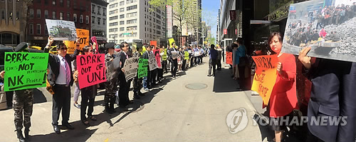 △ 북한 유엔대표부 앞에서 시위하는 탈북자들 (뉴욕=연합뉴스) 박성제 특파원 = 탈북자들이 30일(현지시간) 미국 뉴욕의 북한 유엔대표부 앞에서 북한 인권 유린에 항의하는 시위를 하고 있다. 이들은 이날 유엔본부에서 미국 유엔대표부와 한국 유엔대표부가 공동 주최한 탈북자 증언 행사를 끝낸 뒤 북한 유엔대표부 앞에서 'D.P.R.K out of U.N' 등의 피켓을 들고 구호를 외치며 북한 인권 개선을 촉구했다. 2015.5.1 << 북한자유연합 제공 >> photo@yna.co.kr