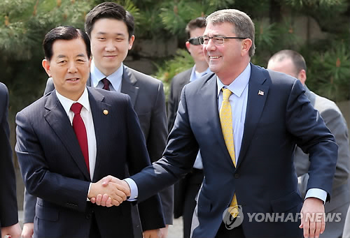 △ 한민구 국방부 장관과 애슈턴 카터 미 국방장관 (연합뉴스 자료사진)
