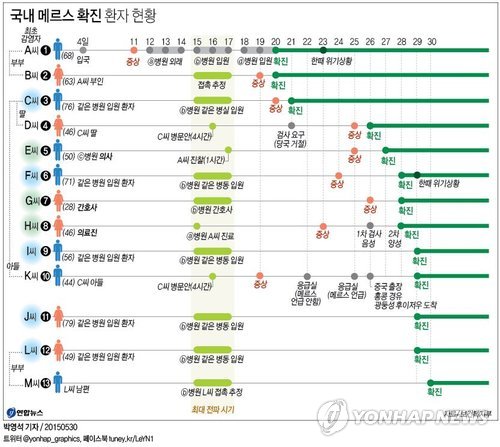 M씨 역시 ⓑ병원에 있다가 메르스에 감염돼 이 병원에서의 메르스 감염 환자는 A씨의 부인 B(63)씨, 같은 병실 환자 C(76)씨, C씨의 딸 D(46.여)씨와 아들 K(44)씨, A씨와 같은 병동 혹은 같은 층에 입원했던 F(71)씨·I(56)씨·J(79.여)씨·L(49.여)씨, 의료진G(28.여) 씨 등 모두 10명이 됐다.