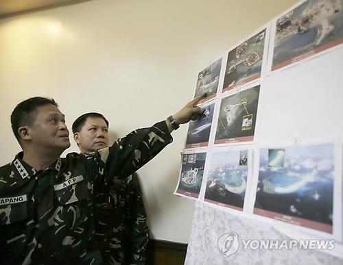 | △ 2015년 4월 20일 필리핀의 마닐라 북동쪽 부대에서 열린 기자회견에서 그레고리오 카타팡 필리핀군 사령관이 남중국해 분쟁 지역에서 중국이 인공섬 매립 공사를 하는 항공 사진을 손가락으로 가리키고 있다.(AP=연합뉴스 자료사진) |