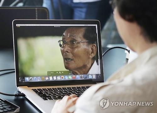 | △ 브라질에 살고 있는 중립국행 포로 출신 김명복씨가 조경덕 감독과 화상 대화를 하고 있다. 중립국행 포로 76명중 한명인 김씨는 고향인 북한 방문을 소망하고 있다.(AP=연합뉴스) |